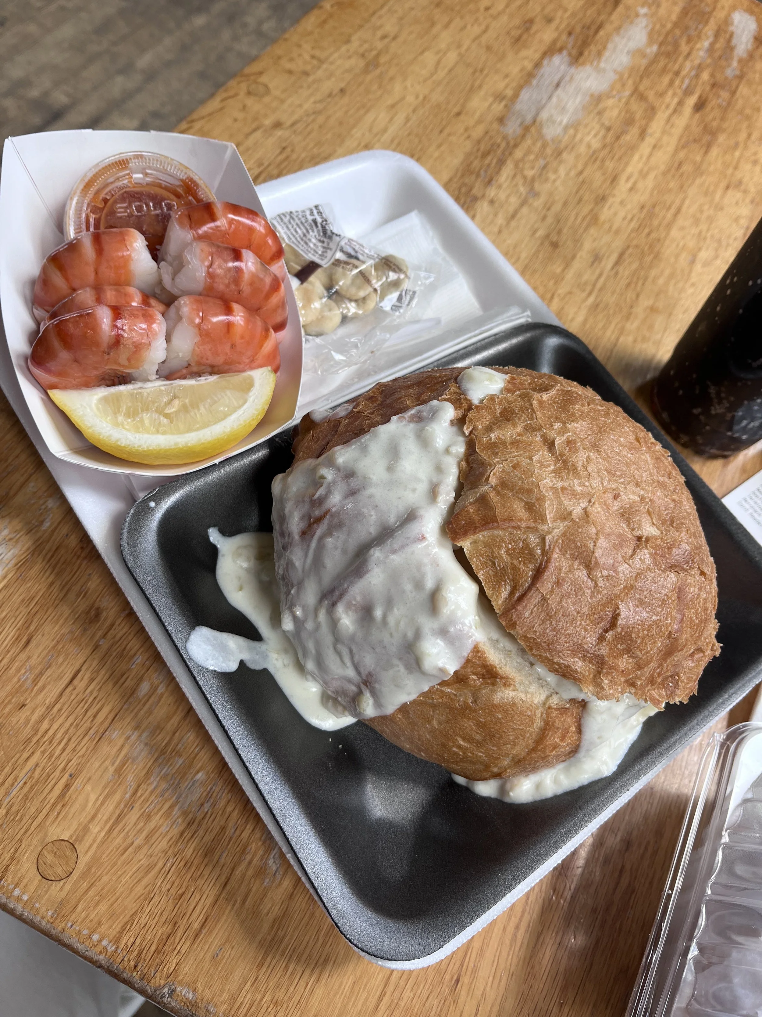 Our first mission was simple: find food. We made our way straight to Boston’s iconic North End, expecting to dive right into a warm bowl of pasta or a hot slice of pizza. What we didn’t expect was the mob of people who had the exact same plan. Every restaurant we passed had a 2+ hour wait or was reservation only. Even the casual pizza joints had lines wrapped around the block. Our group was quickly approaching “hangry” status. After some aimless (and slightly desperate) wandering, a few of us decided to retreat to the hotel restaurant & bar just to get something to eat. Thankfully, a few of us scored a quick win: to-go clam chowder from the Sail Loft. With their dine-in reservations booked out for months, this felt like a small miracle. We sat on benches over looking the harbor with steaming cups of chowder, soaking in the salty air and the comfort of Boston’s signature dish - exactly what we needed to tide us over until dinner.